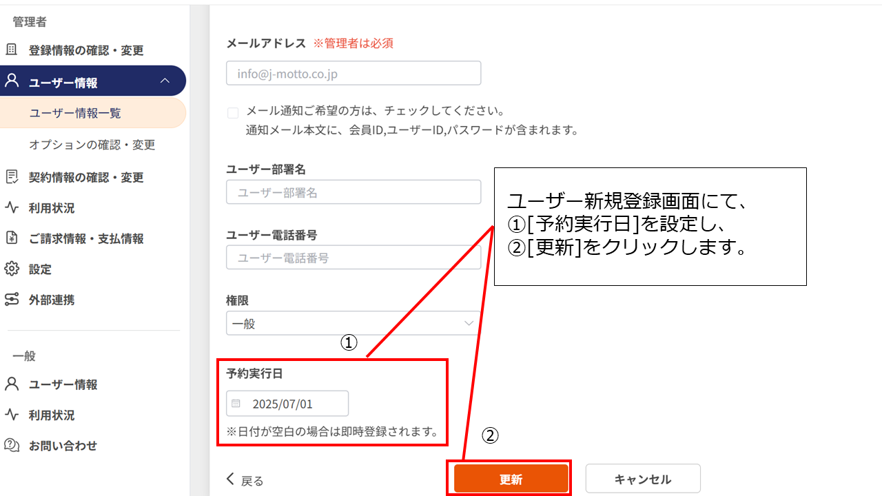ユーザー新規登録の画面にて、下部にある[予約実行日]でご希望の日を選択し、[更新]をクリックすると完了です。