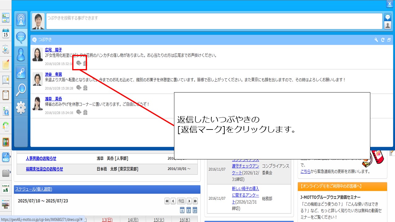 操作方法は、まず、グループウェア画面右上の[吹き出しマーク]をクリックします。