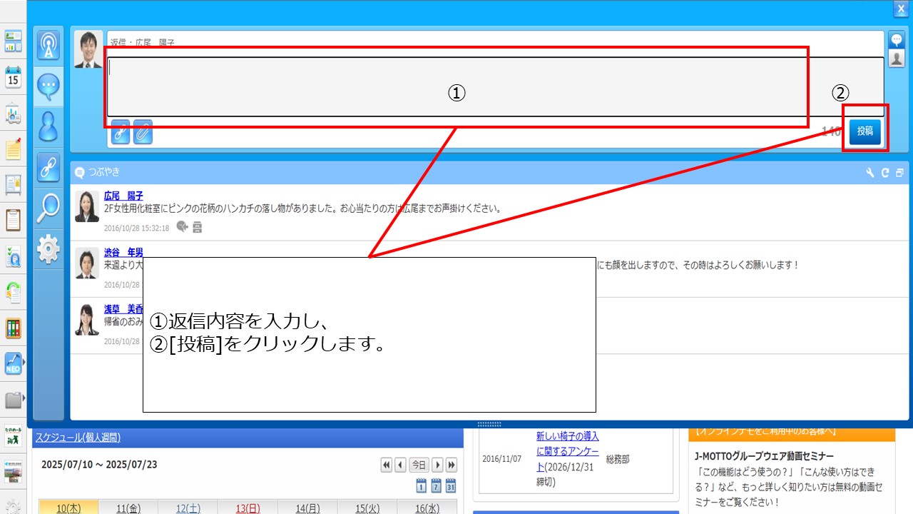 上部の白い枠の部分に返信内容を入力し、[投稿]をクリックします。