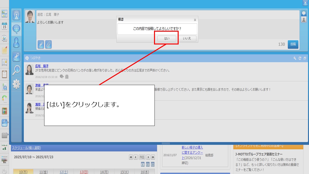 最後に、確認画面が表示されるので、[はい]をクリックすると投稿できます。