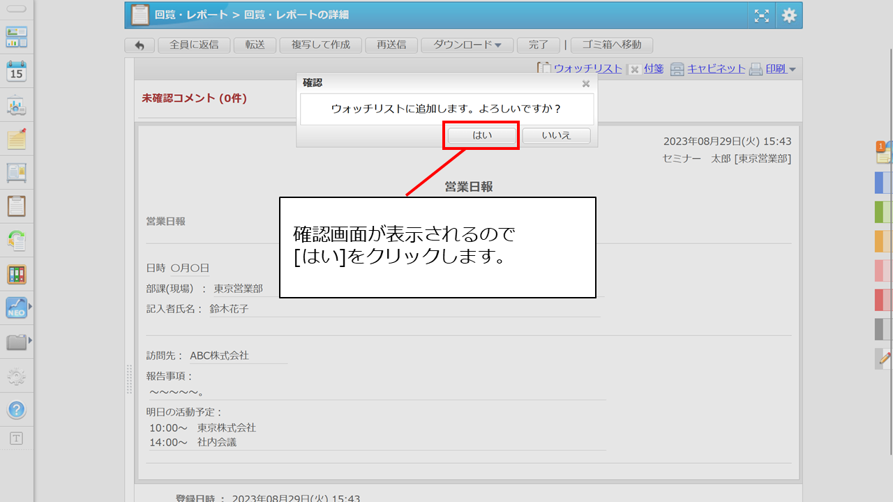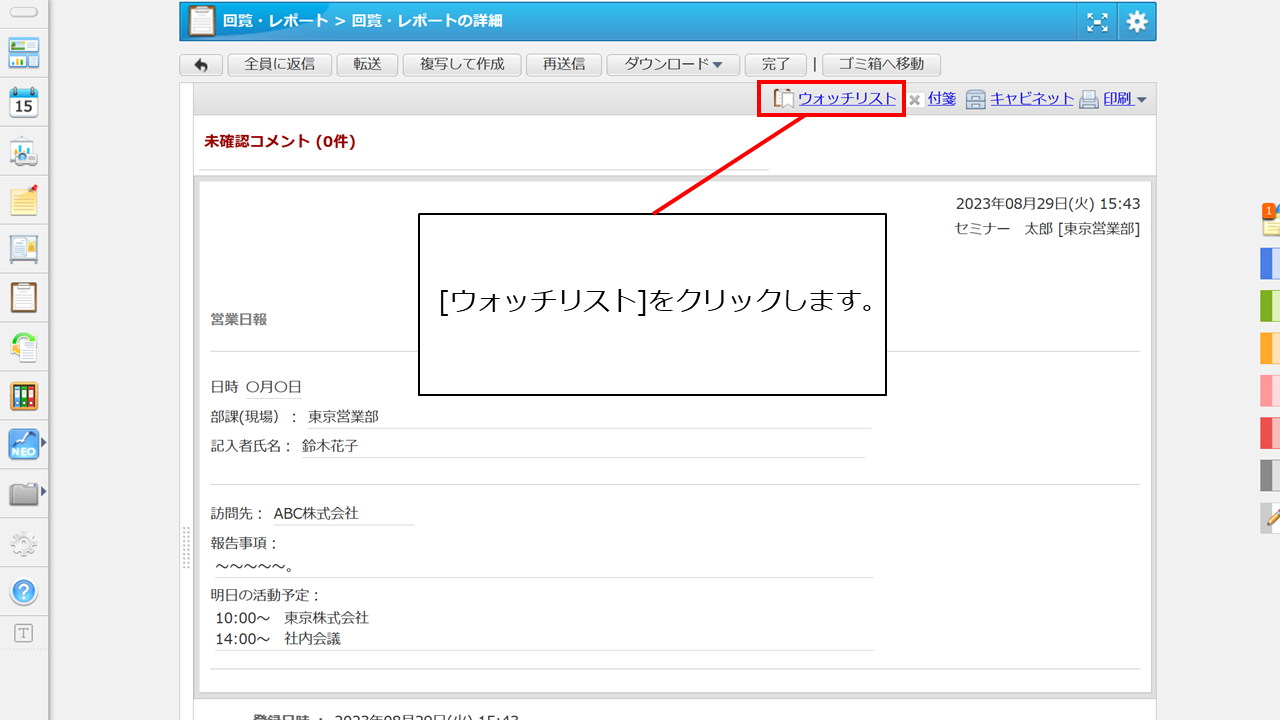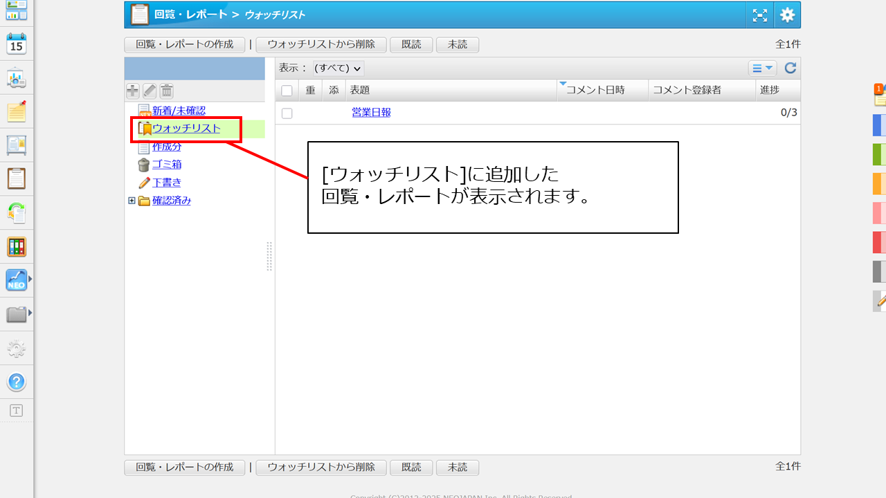 [回覧・レポートの詳細]画面を開き、上部にある[ウォッチリスト]をクリックすると、対象の回覧・レポートがウォッチリストフォルダに保存されます。